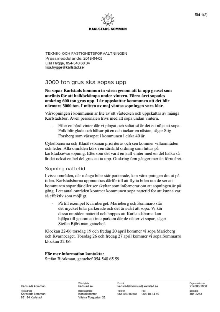 Nu sopar Karlstads kommun in våren genom att ta upp gruset som använts för att halkbekämpa under vintern. Förra året sopades omkring 600 ton grus upp. I år uppskattar kommunen att det blir närmare 3000 ton. I mitten av maj väntas sopningen vara klar.
