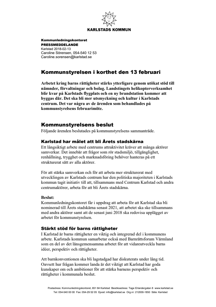 Arbetet kring barns rättigheter stärks ytterligare genom utökat stöd till nämnder, förvaltningar och bolag. Landstingets helikopterverksamhet blir kvar på Karlstads flygplats och en ny brandstation kommer att byggas där. Det ska bli mer utsmyckning och kultur i Karlstads centrum. Det var några av de ärenden som behandlades på kommunstyrelsens februarimöte.