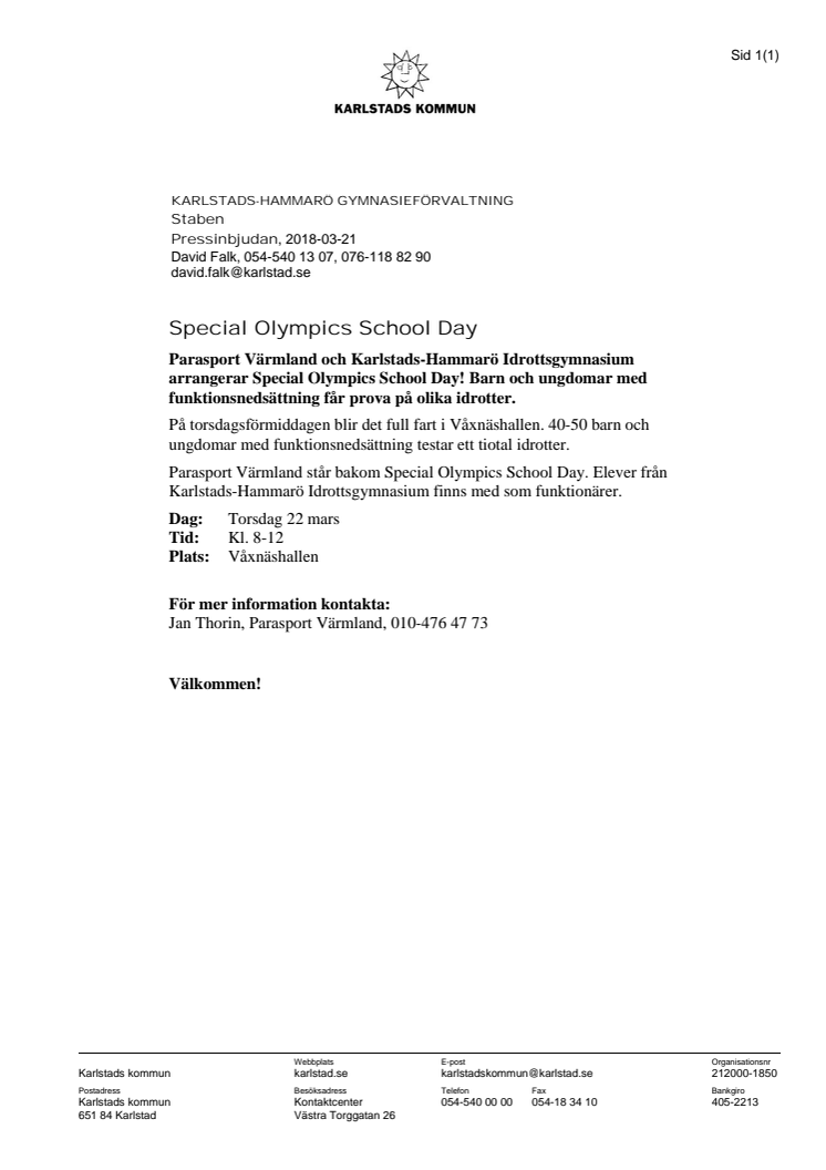 Parasport Värmland och Karlstads-Hammarö Idrottsgymnasium arrangerar Special Olympics School Day! Barn och ungdomar med funktionsnedsättning får prova på olika idrotter.
