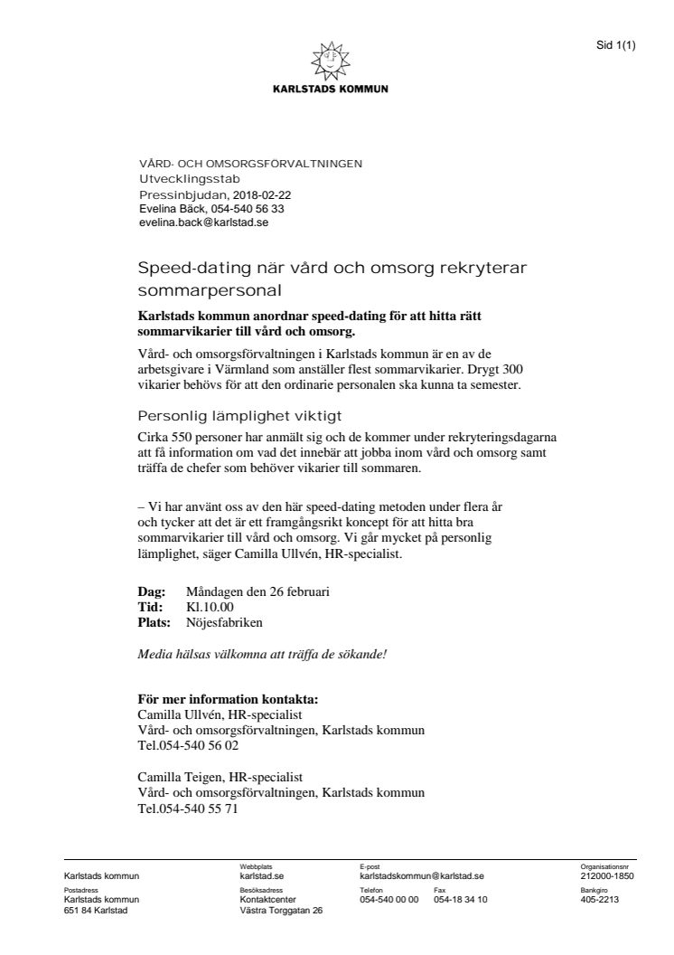 Karlstads kommun anordnar speed-dating för att hitta rätt sommarvikarier till vård och omsorg.