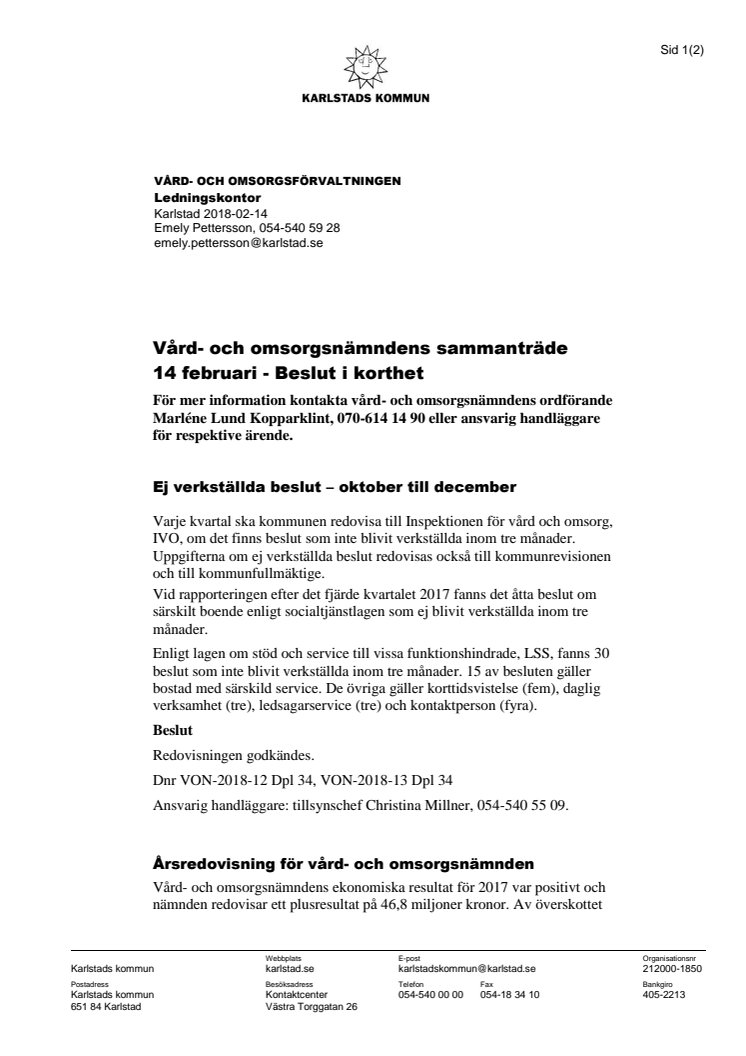 För mer information kontakta vård- och omsorgsnämndens ordförande Marléne Lund Kopparklint, 070-614 14 90 eller ansvarig handläggare för respektive ärende.